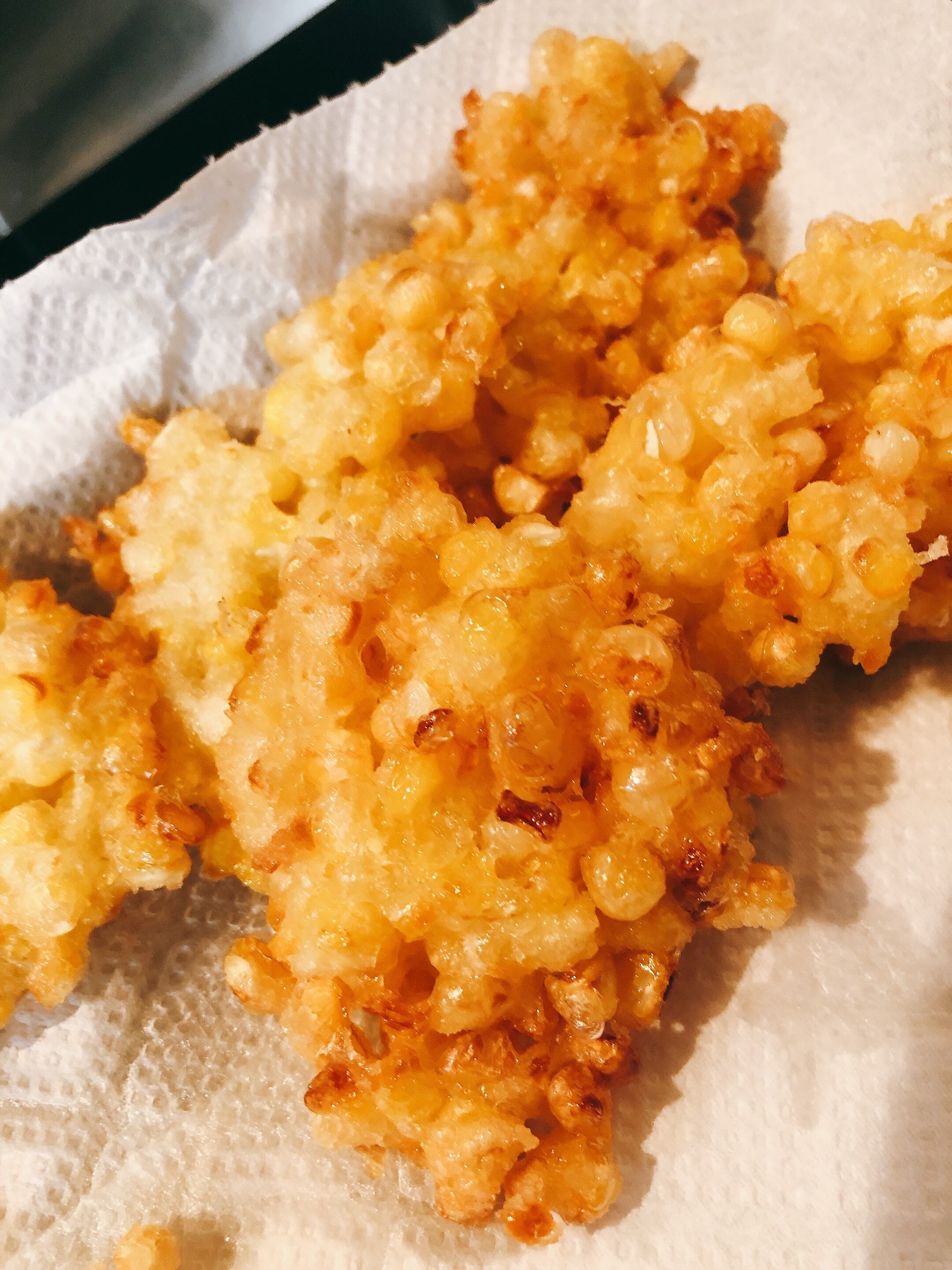 ・お子様人気ナンバー1、トウモロコシのかき揚げ:包丁やトウモロコシカッターで2本分の実をほぐします。塩少々+片栗粉+小麦粉で和えて(まとまりが悪かったら水分調整)、180℃の油で揚げます。粗挽き胡椒をかければビールのお供に。青のりをかければお子様の手が止まらないおやつになりますよ!