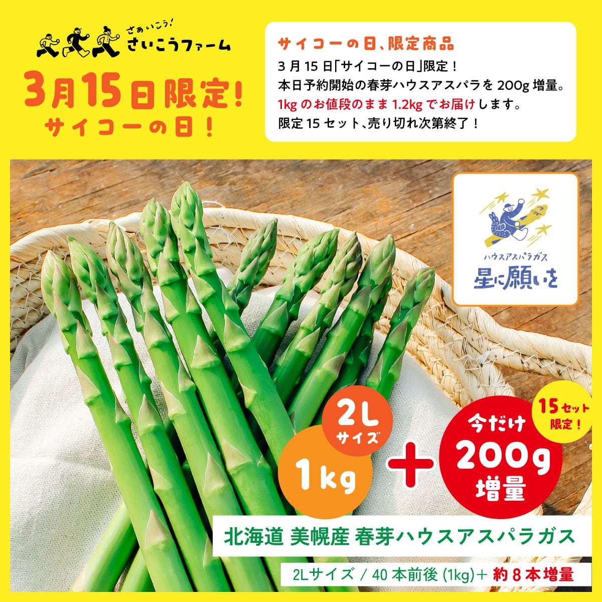 【2026年3月15日サイコーの日限定!】送料無料★春芽ハウスアスパラガス「星に願いを」2L,1.2kg